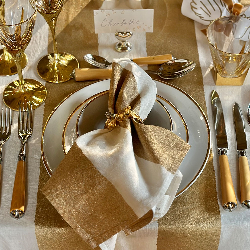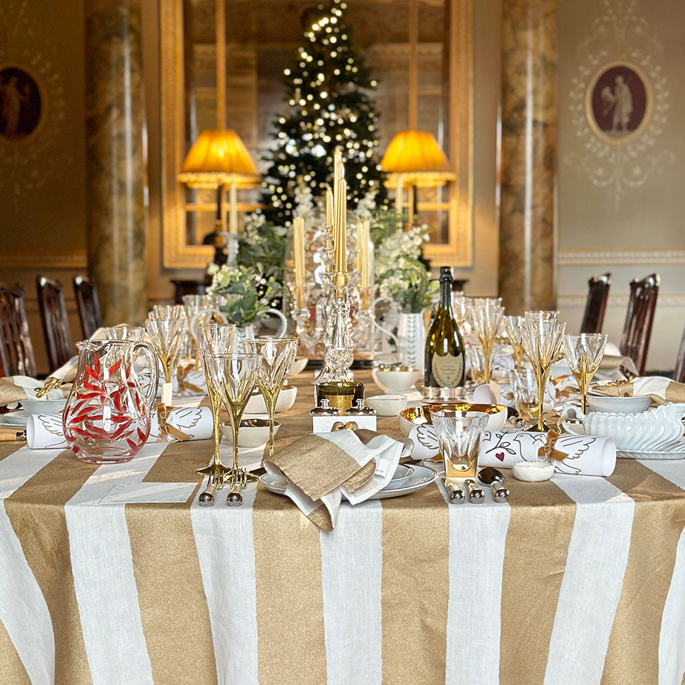 Timeless and versatile, the Gold Stripe Linen Tablecloth combines classic design with understated glamour. Its crisp, linear stripes in gleaming gold offer a contemporary touch while maintaining the soft, luxurious feel of 100% French linen.