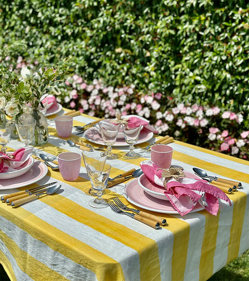 Our dual stripes are available in three colour ways: Avocado Green & Lemon Yellow, Sky Blue & Orange, and Rose Pink & Avocado Green. Each design can be uniquely maximalist or elegantly tailored to suit your preferred your tabletop look.
