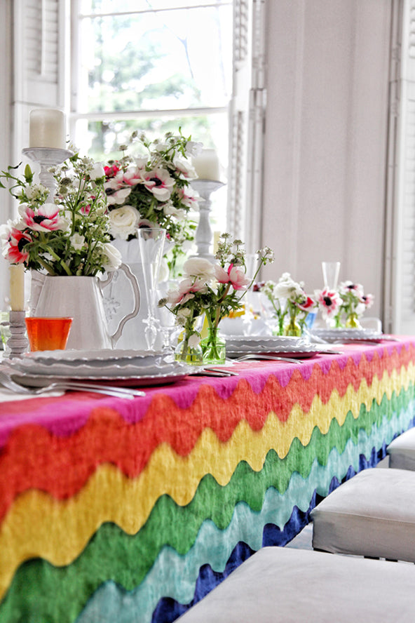 Our vibrant design is a riotous and colourful Trompe L’Oeil of a scalloped rainbow, designed to capture the magic of the rainbow, one of nature's greatest gifts, bringing sunlight and happiness onto the table.