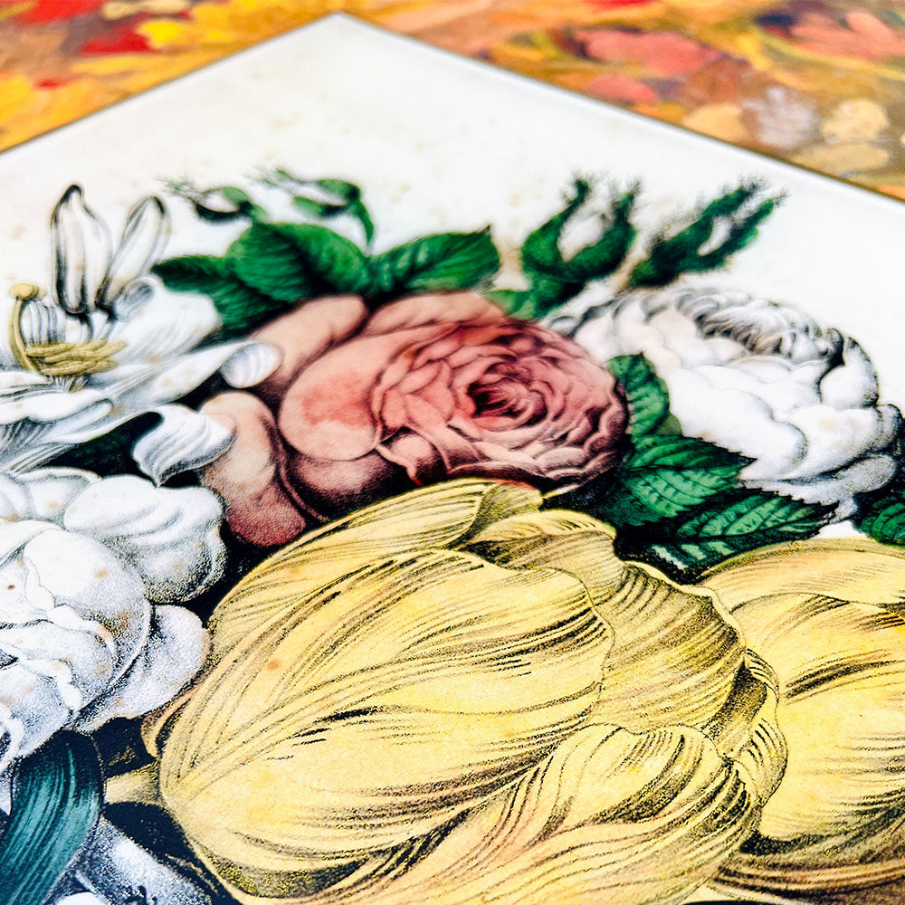 A lush 'Old Masters' style still life captured in luminous layers of glass. Deep, moody floral decoupage — the definition of a conversation piece.