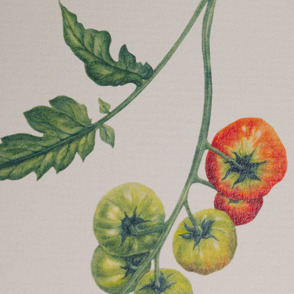 This design features trailing tomato vines, its vibrant hues evoking a picture of an abundant & juicy harvest.