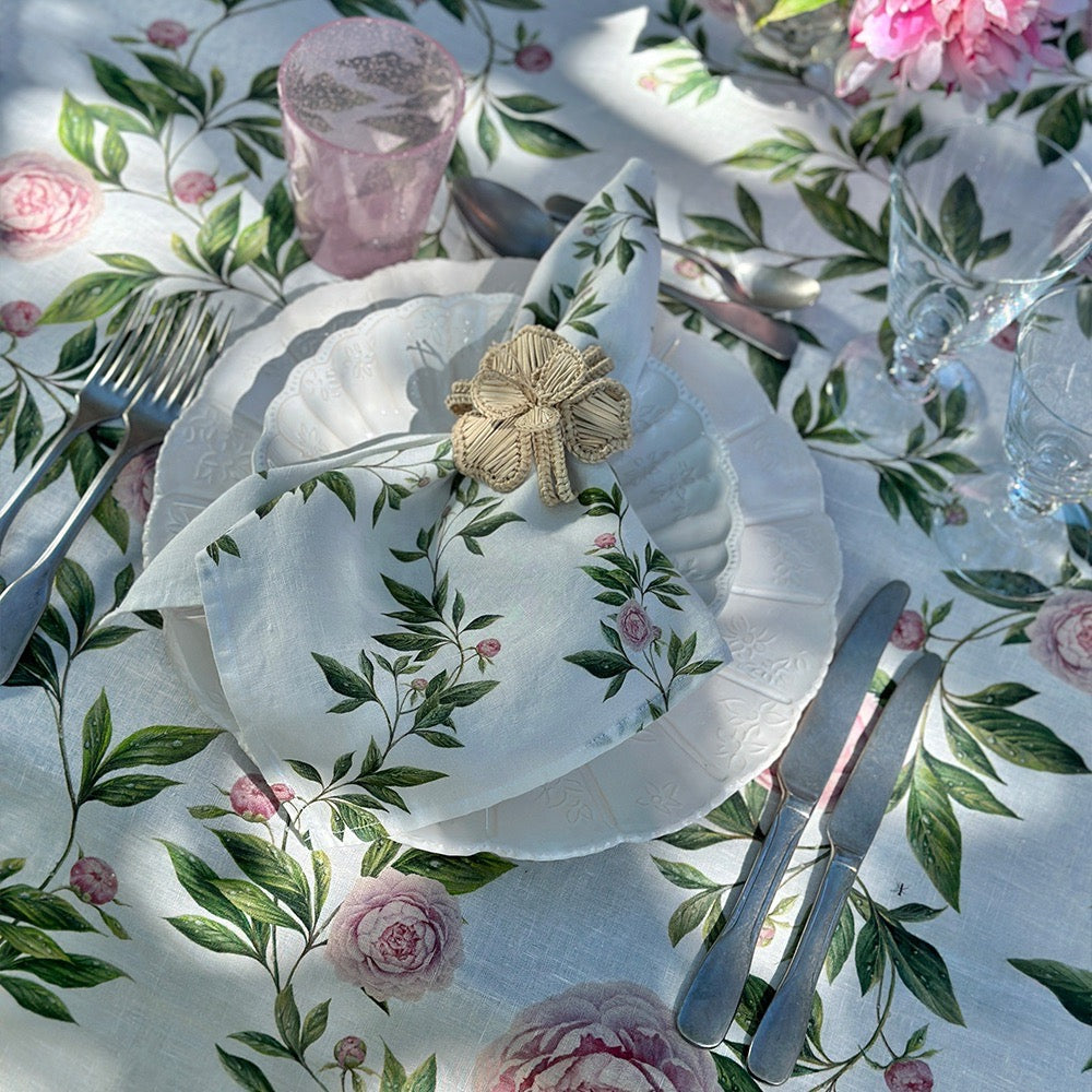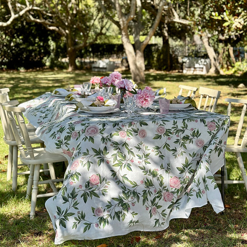 An ode to nature’s timeless beauty, the Trailing Peony design features full, opulent blooms that seem to dance across the linen with soft, fluid movement. Delicately rendered petals and rich, romantic colours bring a sense of grace and abundance to the table, echoing the elegance of a garden in bloom. Crafted from 100% pure French linen, the tablecloth and matching napkins offer a refined yet natural charm, perfect for turning any meal into a celebration of beauty and nature’s most beloved flower.