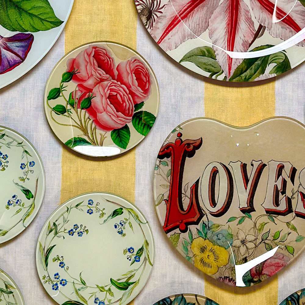 Please Note: each decoupage glass piece is handcrafted in John Derian’s studio using archival imagery and sealed for everyday display; wipe clean with a soft, damp cloth.