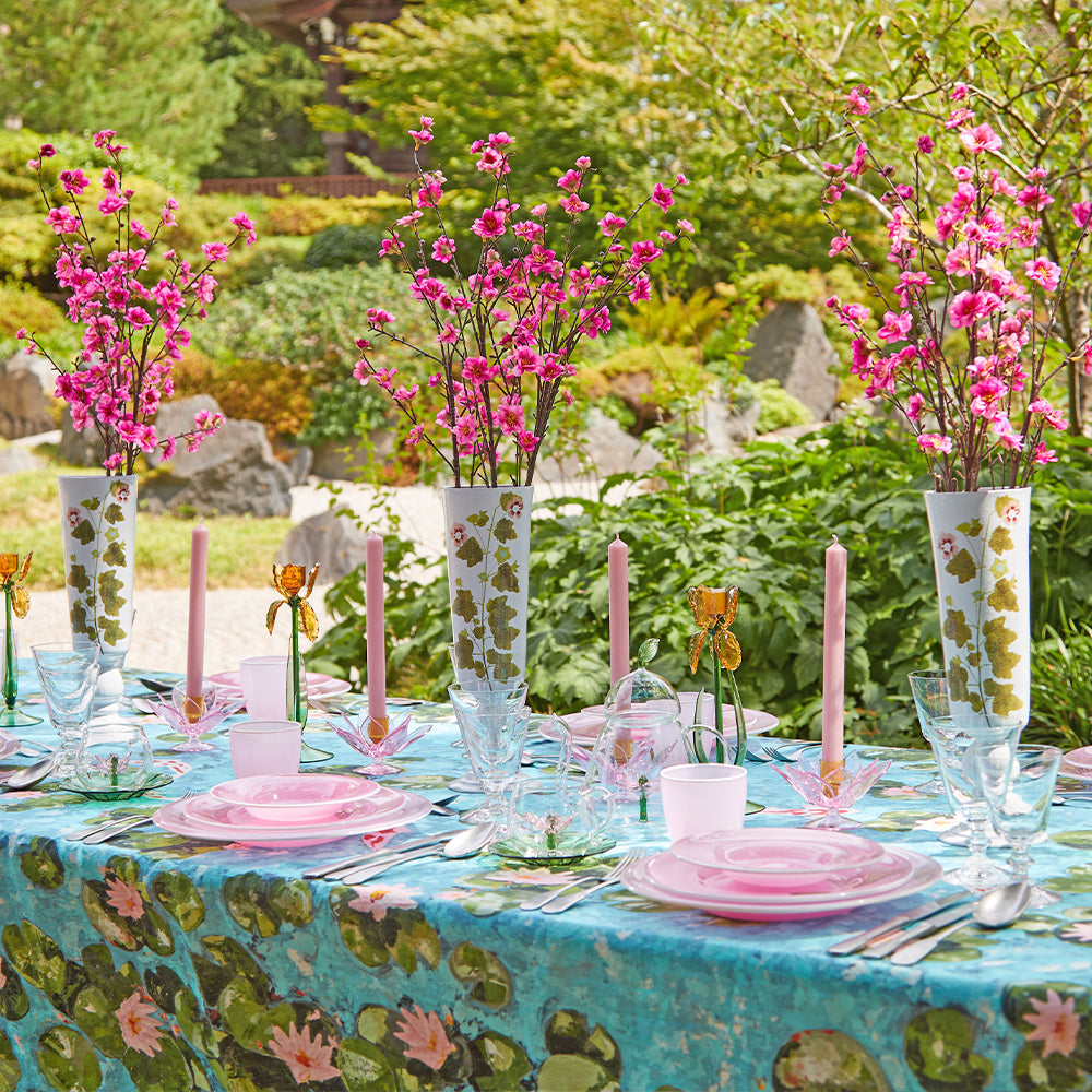 The vibrant colours of the linen evoke the tranquillity of a serene water garden, almost like you’ve stumbled into a painting in your own dining room.