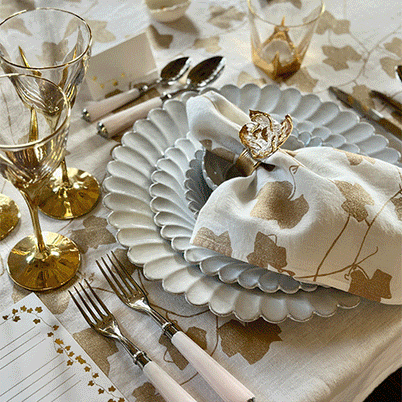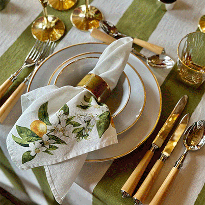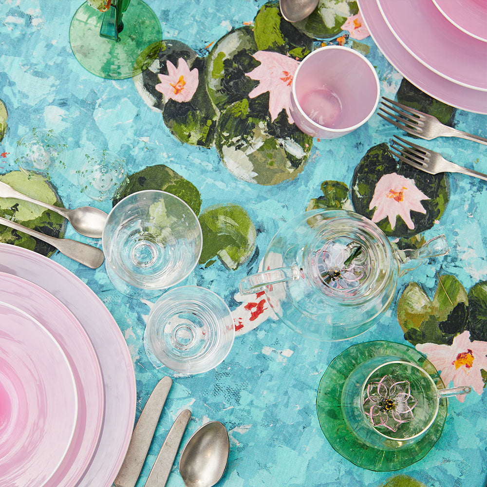 The tablecloth and napkin collection invites a sense of peacefulness to the table, with gentle brushstrokes that create the impression of movement and true depth in the water, amidst lush green lily pads. Whether you’re hosting a garden brunch or a romantic candlelit dinner, Waterlily prompts a certain kind of atmosphere that your guests will never want to leave.