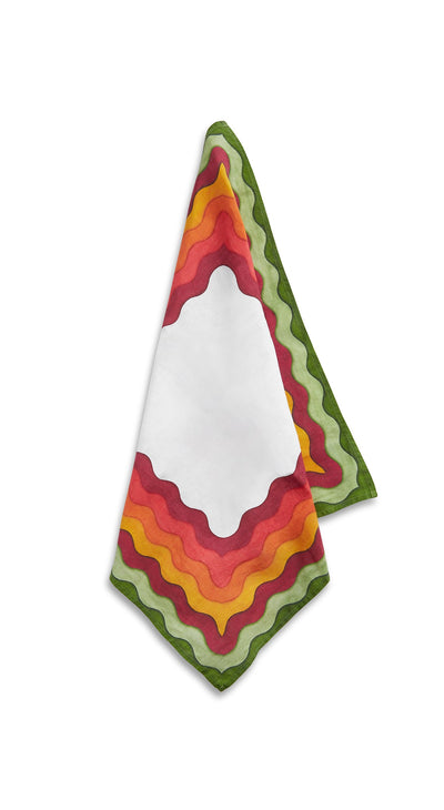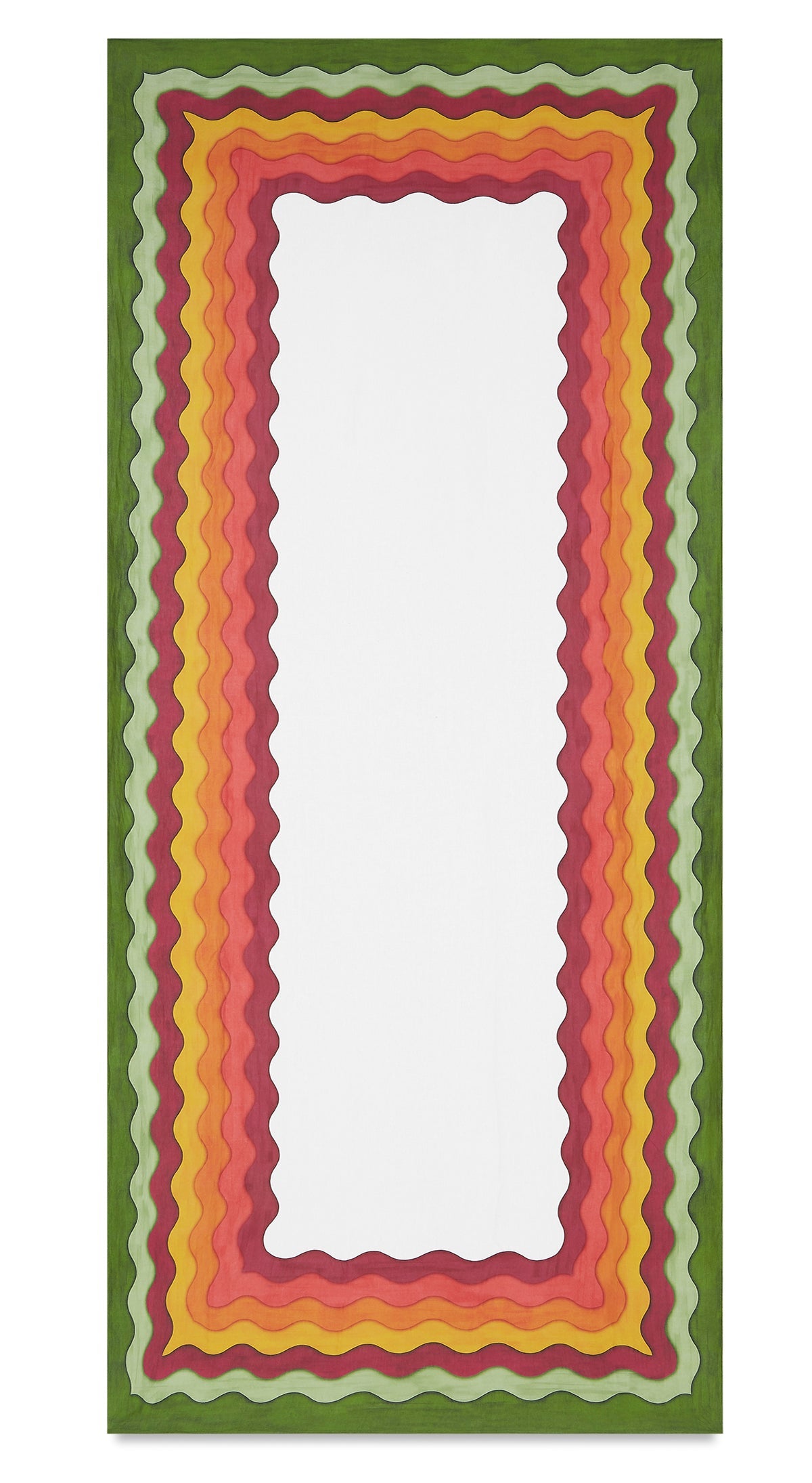This impactful design is a Trompe L'Oeil of a scalloped rainbow, designed to capture the magic and mystery of the natural phenomena and is coloured by rich, warm shades that typify the cooler months.